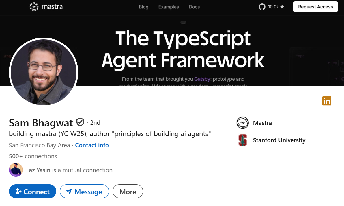 Sam Bhagwat – Founder of Mastra (YC W25), author of Principles of Building AI Agents, and a seasoned open-source contributor with deep expertise in JavaScript and TypeScript ecosystems.